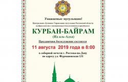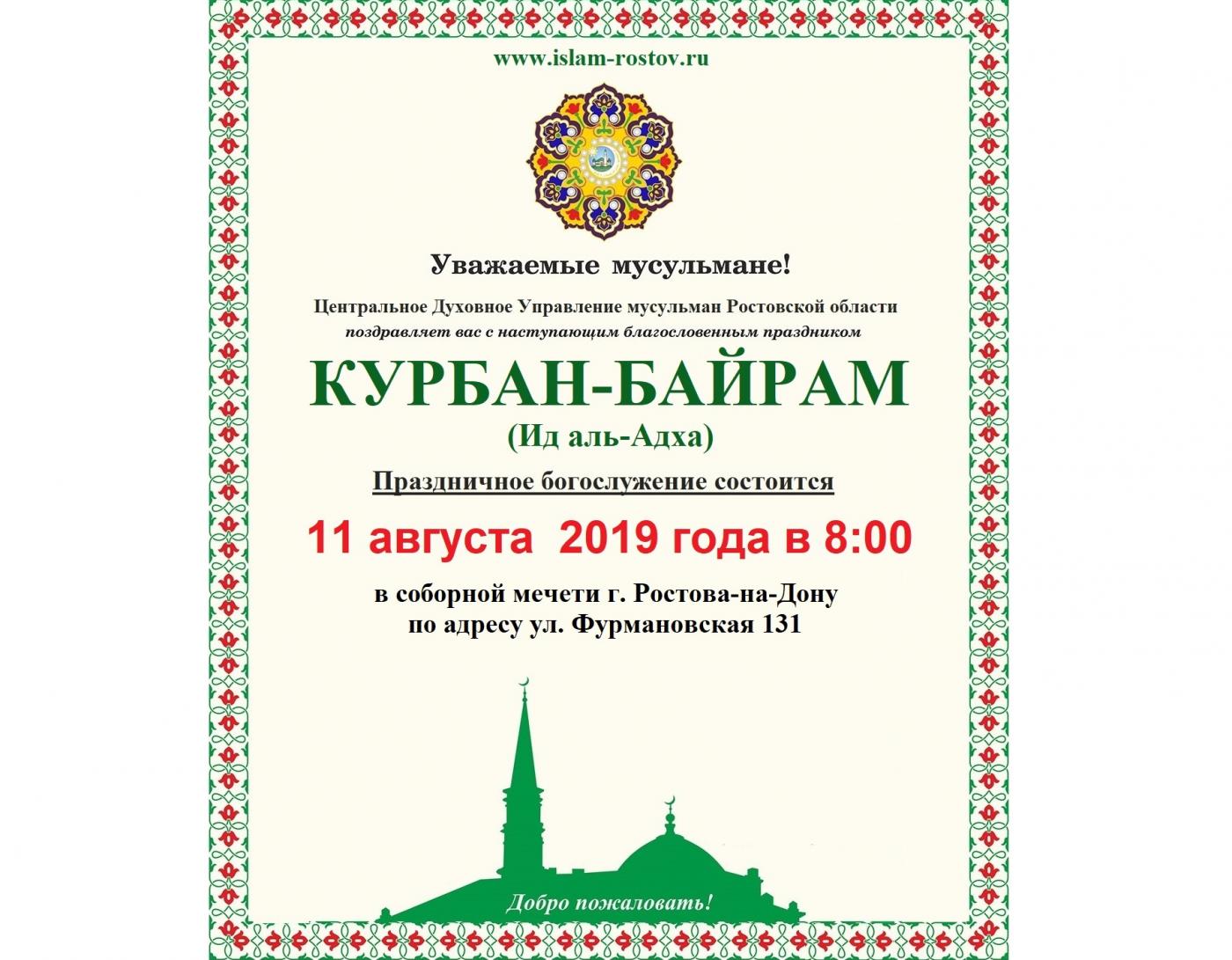 Центральное Духовное Управление мусульман Ростовской области поздравляет Вас с наступающим праздником жертвоприношения Курбан-байрам (Ид аль-Адха) и объявляет о том, что праздничная молитва состоится Инша Аллах 11 августа 2019 года.