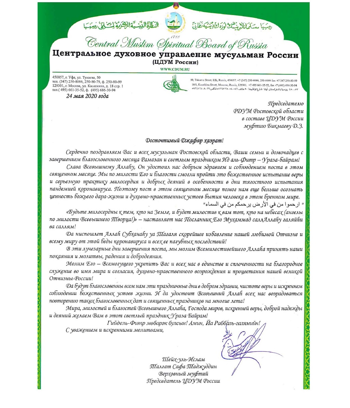 Традиционно, в адрес мусульман были направлены поздравления от Президента Российской Федерации Владимира Владимировича Путина, Верховного муфтия России Талгат хазрата Таджуддина, Муфтия Ростовской области Джафар хазрата Бикмаева, а также от глав Духовных управлений мусульман различных регионов России.
